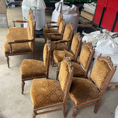 Sohva,kaksi nojatuolia ja pikkutuolia. Pöytä on myös (ei kuvaa). Päällykset uusittu 70- luvulla. Kaksi tuolia, joissa vanha päällystys,toisessa rikkinäinen.