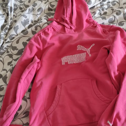 Käytetty Puman naisten huppari, väri ei syvän musta, väriä kulunut mutta ehjä ja muutoin siisti. Jäänyt kaappiin pyörimään. Alas asti vetoketju, pinkki yksityiskohta rinnan kohdalla tekstinä ja logo pienellä vasemmassa hihassa.