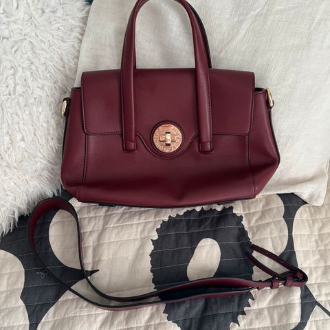 Laukussa on pientä kulumaa erityisesti hihnan päissä, mutta hihnakin on helposti vaihdettavissa haluttaessa. Muuten laukku on hyvässä kunnossa. Kompakti koko (20 × 10 × 15 cm).