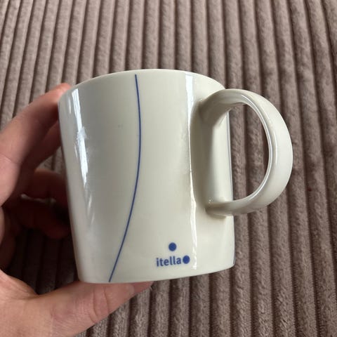 Arabia Itella muki, valmistettu posliinista. Väri valkoinen sinisillä viivoilla. Soveltuu mikroaaltouuniin ja astianpesukoneeseen. Käytännöllinen kahvimuki tai teekuppi.