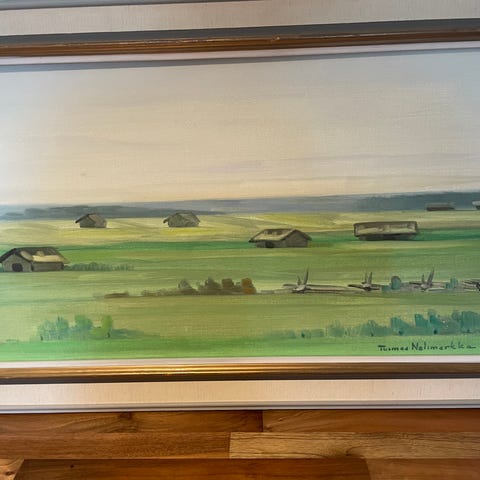 Tuomas Nelimarkan suosittu ja arvostettu latomaisemataulu Pohjanmaalta. Taulu on kehystetty puisella kehyksellä ja siinä on ripustuslanka takana. Taulun koko on Lev 88 cm ja Kork 62 cm. Taulu Lahdessa, vain NOUTO. Maksu käteisellä tai MobilePay.