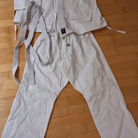 Itsepuolustuspuku esim. Hokutoryu ju-jutsu tai Karate-käyttöön. 100% Puuvillaa, erittäin vahva. Rinnassa näkyy jälki jossa ollut Hokutoryu -kangasmerkki. Kangasmerin saa kaupanpäälle jos sille on käyttöä. Rinnan leveys noin 63cm, pituus noin 81cm, hihan pituus kainalosta noin 45cm, housujen lahkeen pituus noin 98cm.