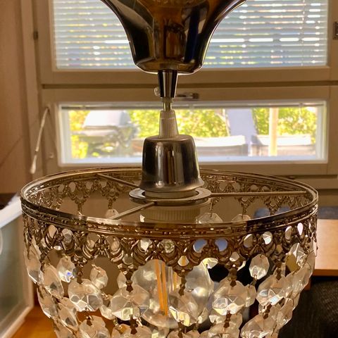 Sessak kattovalaisin. Kaunis ruskea kristalleilla ja lehdyköillä koristeltu kattokruunu. Joitakin kristalleja puuttuu. Huom, myynnissä myös saman sarjan pienempi riippuvalaisin (molemmat yhteishintaan 120).