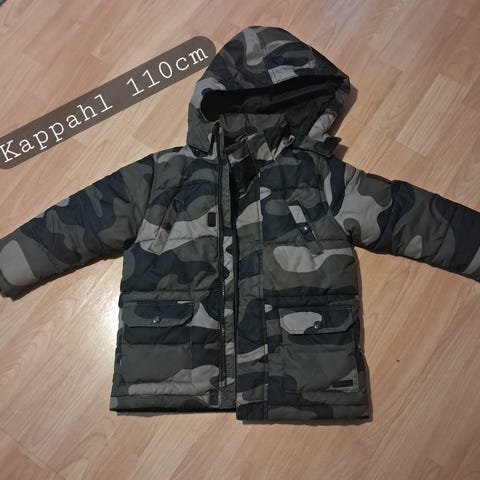 KappAhl lasten toppaparkatakki, koko 110, musta väri. Takissa on vetoketjutaskut, irrotettava huppu, ja karvareunus hupussa. Siisti, ehjä ja tahraton.