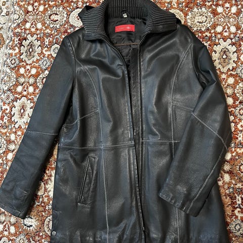 Kotimainen BigL:n haljasnahkatakki, väri ei ole ihan musta vaan tumman harmaa lähinnä. Tereet on mustaa pintanahkaa. Tikkivuori. Karvat on muodikasta leoparditekokarvaa. Hihansuut voi kääntää tai pitää suorassa. Koko 38 vastaa ehkä lähinnä M kokoa.