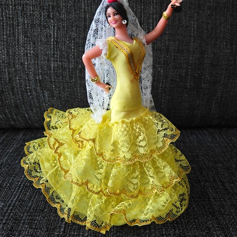 Noin 20cm korkea (ylinnä olevasta kädestä mitattuna) täysin käsinmaalattu flamenco-tanssijatar