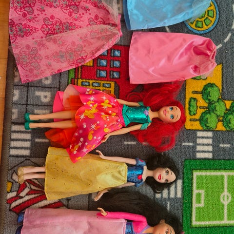 Disney-nuket: Tähkäpää, Flynn, Mulan, Tuhkimo, Merida. Kolme ylimääräistä mekkoa ja parit kengät. Käytön jälkiä, hiukset takkuisia, tähkäpäältä puuttuu kengät ja mekko vähän rikki.