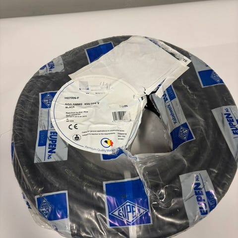 Varaston siivouksen yhteydessä ylimääräiseksi jäänyt kaapelikieppi. Kumikaapelia, 5x2,5mm, avaamaton paketti
