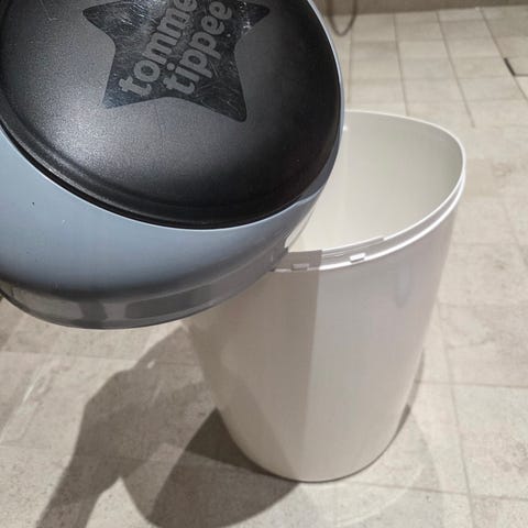 Siisti ja ehjä roskis. Ei sisällä kasetteja. Pitää hajut myös tavallisilla pusseilla.