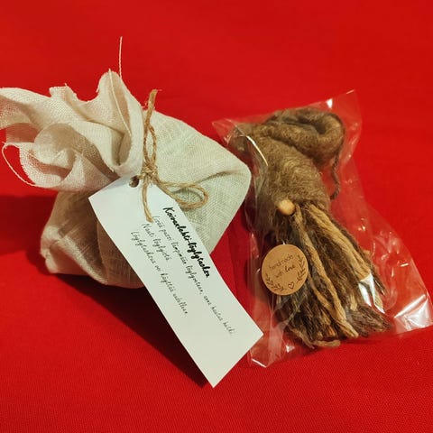 Kolme huopatonttua, enkeli ja lumiukko joulua koristamaan. Yhteishinta 3 euroa.