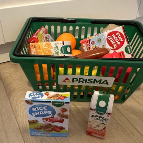 Pienen kokin leikkeihin vihannessetti korilla&muita raaka-aineita (kala, sämpylät ja croissant) ja 4 muovilasia