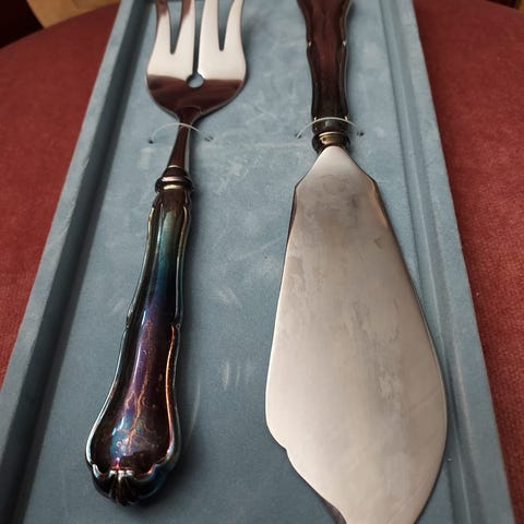 Kultakeskus Oy lusikkasetti, sisältää 6 kappaletta lusikoita. Mukana alkuperäinen sininen säilytyslaatikko Kultakeskus Oy -logolla. Lusikoiden varret ovat alpakkaa jäljitellen hopeaa ja lusikan pesät ovat kultapinnoitetut.