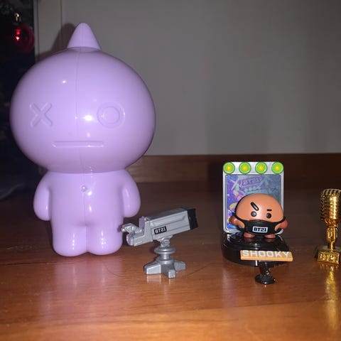 BT21 Chimmy hahmofiguuri sisältäen sinisen säilytysrasian, hahmon, lisäosan ja värikkään ohjelehtisen. Materiaali muovia. Sopii keräilyyn tai koristeeksi.