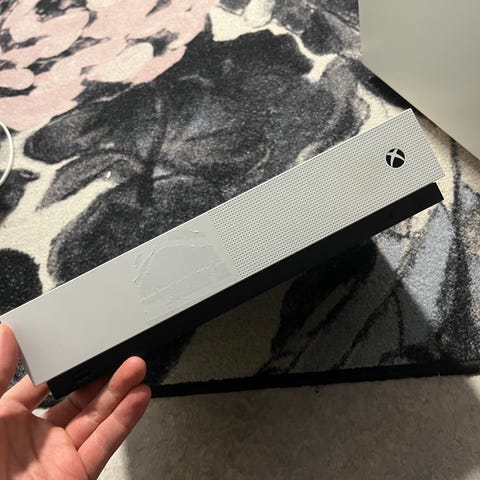 Microsoft Xbox One pelikonsoli musta väri, sisältää ohjaimen, lataustelineen ja virtalähteen. Konsoli tukee HDMI-liitäntää ja on suunniteltu kotikäyttöön pelien pelaamiseen.