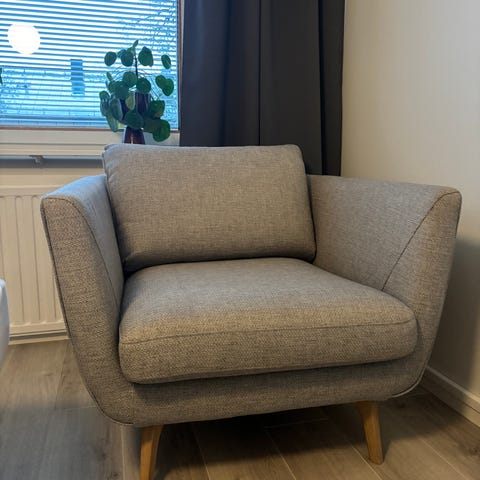 No brand nojatuoli valkoisella buklee-tyyppisellä verhoilulla ja puujaloilla. Tuolissa on leveä selkänoja, pyöristetyt käsinojat ja pehmustettu istuin. Soveltuu olohuoneeseen tai muuhun oleskelutilaan istuimeksi ja rentoutumiseen.