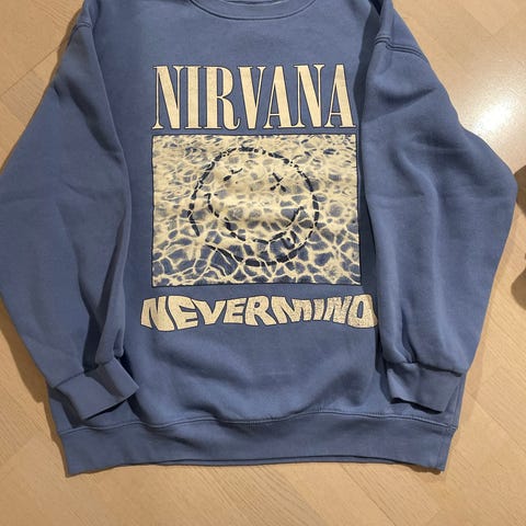 H&M Nirvana pusero, beige värinen, naisten koko S. Puserossa on huppu ja edessä sekä takana Nirvana-yhtyeen tekstit ja grafiikat. Materiaali on puuvillaa