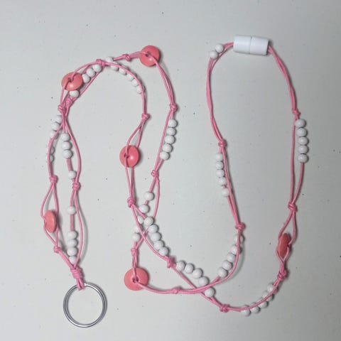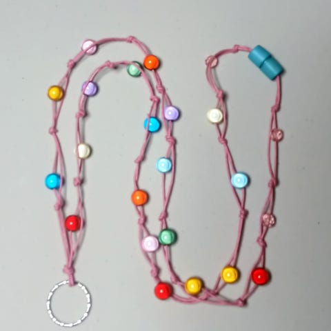 Puuvillanyöri, lasi- ja akryylihelmet.