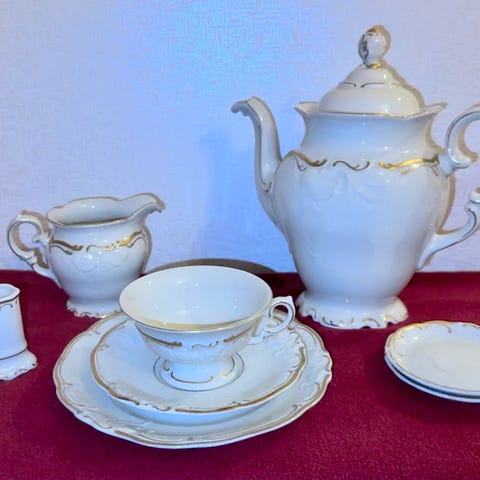 Serviisi sisältää 2 isoa kahvi - tai teekuppia, aluslautaset ja 4 kpl 21 cm. Kakku-/leipä- tms. lautasta.