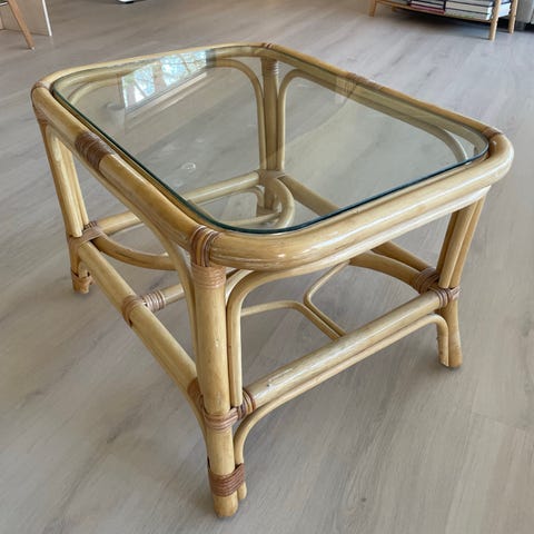 Siisti rottinkipöytä, punokset ehjät ja lasitaso virheetön.