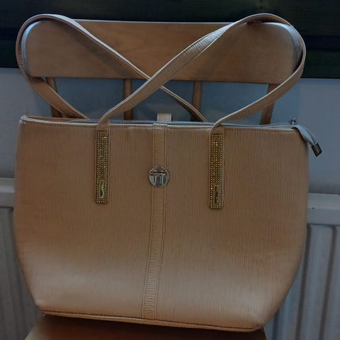 Beige ja musta laukku (keskellä) ehjiä mutta käytettyjä, lyhyet ja pitkät hihnat molemmissa.