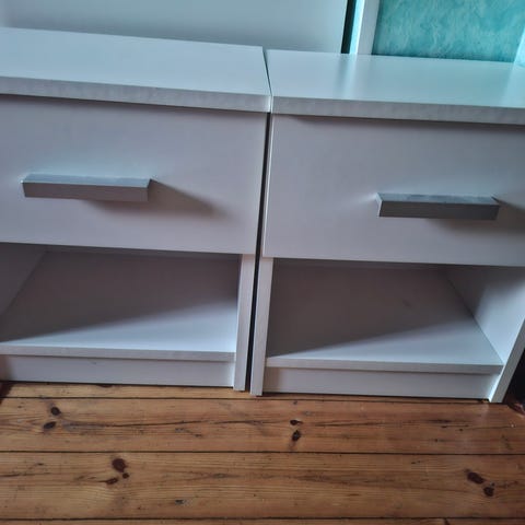 2 valkoista Askon yöpöytää. Tyyliin kuuluvaa kulumaa molemmissa.