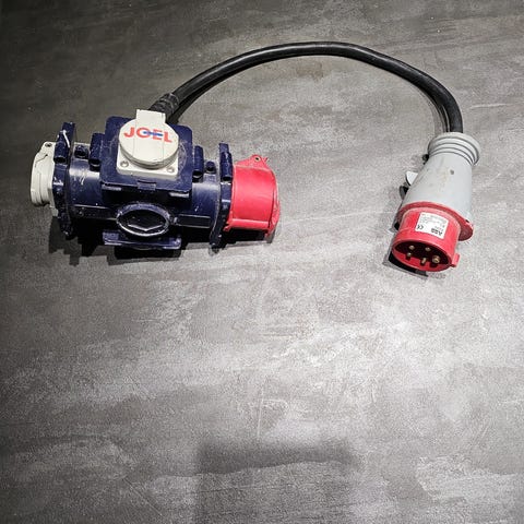Adapterissa on 3-vaiheinen CEE-pistoke (punainen) ja kolme yksivaiheista Schuko-pistorasiaa.