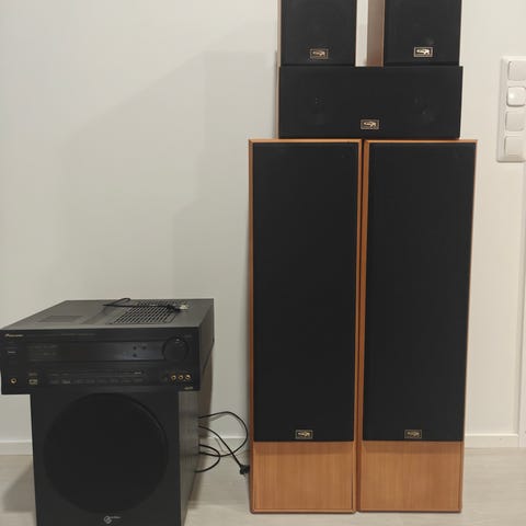 Kuvien mukaiset, ehjät ja siistit kaiuttimet, kaksi korkeaa etukaiutinta, keskikaiutin, sekä kaksi sivu/takakaiutinta. Lisäksi Pioneerin vahvistin. Tarvittaessa annan mahdollisimman hyvin lisätietoja.