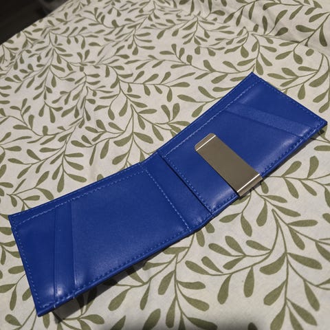 Musta lompakko nahkajäljitelmää (materiaali polyesteri). Paikat 8 kortille, seteleille ja vetoketjullinen tasku kolikoille. Leveys 19 cm, korkeus 10 cm, paksuus 3 cm.