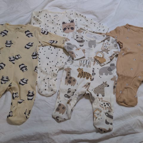 Kolmen yöpuvun setti Next baby koossa 56. Yöpuvuissa on kukkakuviollinen teema ja niiden taustavärit ovat vaaleanpunainen, valkoinen ja persikka.