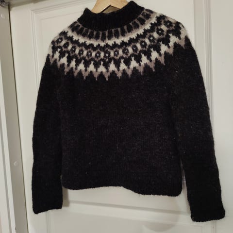 Villapaita, jossa islantilais villapaidalle tyypillinen kuviointi. Äitini on neulonut tämän minulle, mutta tämä on itselle nykyisin vähän tiukka. Noin s koko. Kaikai n.40cm ja kauluksesta helmaan n.72cm.