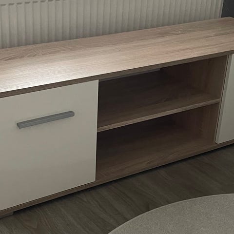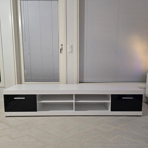 Valkoinen TV-taso, tukeva ja tilava, tarjoaa runsaasti säilytystilaa.