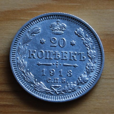 Hopea, 20 kopeekkaa,Venäjä 1915
