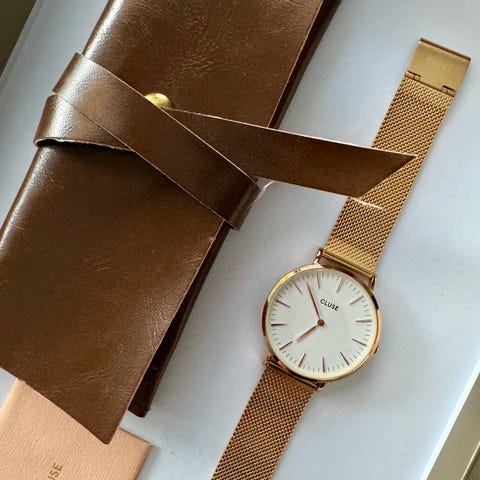 Myynnissä tyylikäs Votch Classic Gold White -rannekello minimalistisella muotoilulla ja vegaanisella nahkarannekkeella. Kello sopii hyvin sekä arkeen että juhlaan — sen siro kultainen kuori ja valkoinen kellotaulu tekevät siitä ajattoman ja elegantin. Toimiva ja siistikuntoinen, mutta kevyttä käytön jälkeä löytyy kuoresta ja lasista. Paristo toimii.