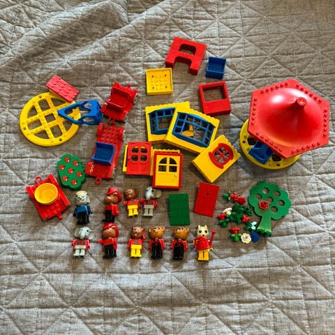Kuvan mukainen Fabuland lego setti 80-luvun aarteita: talo, ihana talonväki ja extra hahmot tavaroineen. Alkuperäiset ja käyttämättömät tarrat taloon.