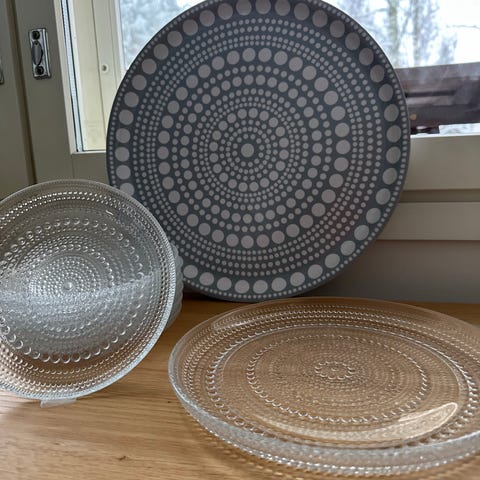 Iittala Kastehelmi -sarjan kulho ja tarjotin kirkasta lasia. Kulhon halkaisija 14 cm ja tarjottimen halkaisija 31,5 cm. Monikäyttöinen lasiastiasarja, jossa koristeena pisaramaiset lasin kohoumat. Kulho 40€ ja kakkuvati 60€ = yhdessä 90€