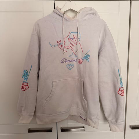 Viinipunainen Diamod huppari. Ehjä,haalistuneen näköinen, Teksi haalea pinkki.Etutasku. Koko L. Muutaman kerran ollut päällä