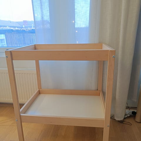 IKEA lastenhuoneen hoitopöytä, valmistettu valkoiseksi maalatusta puusta. Sisältää useita tasoja säilytystilaa varten. Sopii lastenhoitoon ja vaatteiden järjestelyyn. Paikoitellen kulumaa, mutta ehjä ja toimiva.