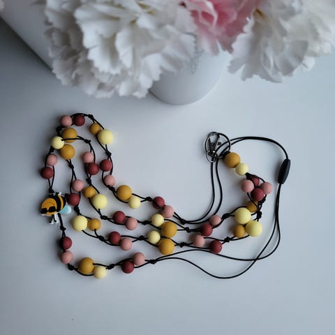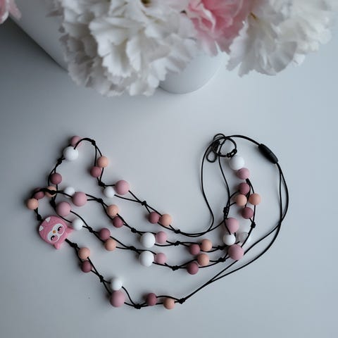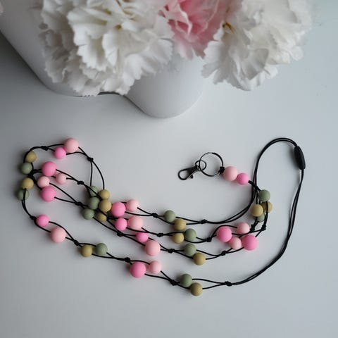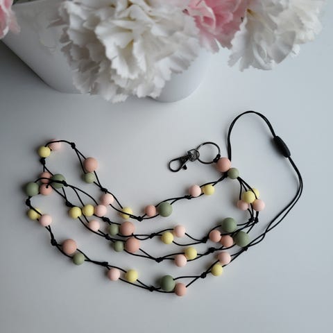 Yliolan avainkaulanauha silikonihelmistä 12mm & 15mm. Tuplanaru. Turvalukko. Pituus noin 140cm, on lyhennettävissä.