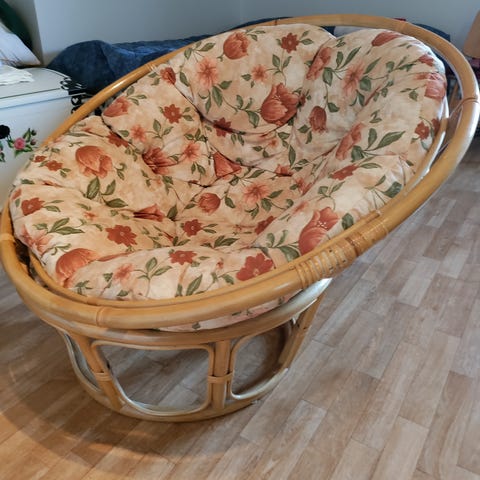 Ihana rottinkinen pallotuoli. Halkaisijaltaan noin 100cm ja istuinsyvyys n. 45cm.