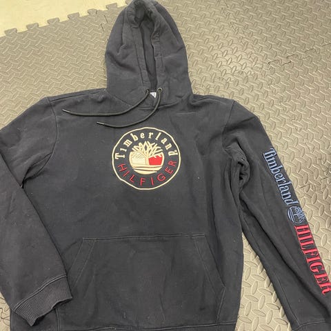 Tommy Hilfiger Timberland yhdistetty huppari valkoisena, kokona M. Hupparissa on Timberlandin ja Hilfigerin yhteisbrändäys, jossa näkyy molempien logot edessä ja hihassa. Materiaali ja muut tarkemmat tiedot eivät ole saatavilla kuvista.