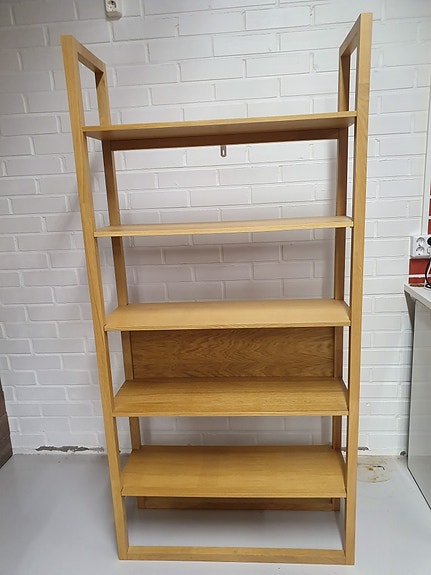 Yrityksen muuton vuoksi mallikappaleet myydään nyt poistohintaan. Kaunis ja laadukas Jugend-kirjahylly, hyllyt ja kaappiosa tammiviilutettua kalustelevyä, runko mustaksi maalattua metalli, jaloissa oleva koriste massiivitammea. Uuden kaapin hinta on 750 euroa - mallikappale myydään puoleen hintaan: 375 euroa. Brändi: Woodman. Suunnittelija: Leonhard Pfeiffer.