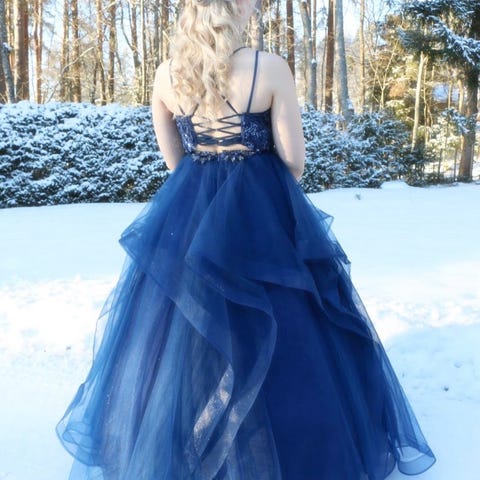 Mecco vanhojentanssimekko, Ilta- tai juhlapuku, koko 38, väriltään kulta. Mekossa on kerroksellinen helma ja yläosa on koristeltu kimaltavilla yksityiskohdilla. Väri hiekka silkkisatiini. Mekko on sopiva noin 168-174 cm pituiselle. Hintaan kuuluu vannehame ja juhlajakku.