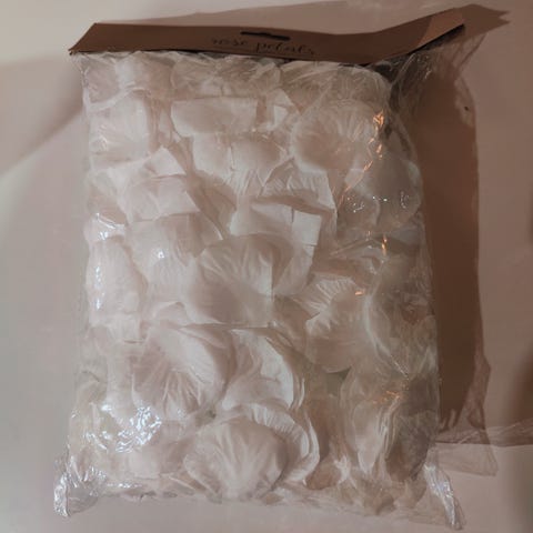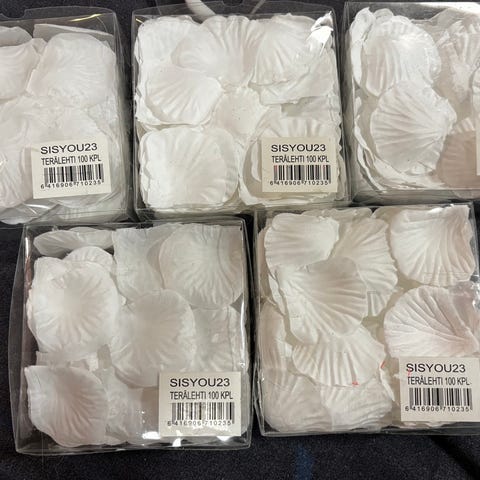 Valkoisia ja vaalean punaisia kukkien terälehtiä koristeeksi pöytiin tai riisin sijana heitettäväksi häissä. Iso osa valkoisista lehdistä vielä avaamatta nipuissa, yksittäinen terälehti läpinäkyvä. Alunperin valkoisia ollut 2000 kpl, näistä vain n. 1/3 osa käytettiin. Lisäksi pienempi määrä vaalean punaisia terälehtiä.