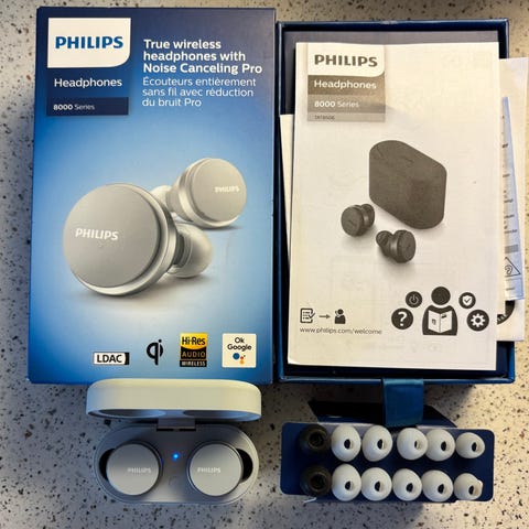Philips langattomat kuulokkeet musta väri, mukana säilytyspussi ja käyttöohje. Kuulokkeet sopivat langattomaan kuunteluun ja tarjoavat liikkuvuutta ilman johtoja.