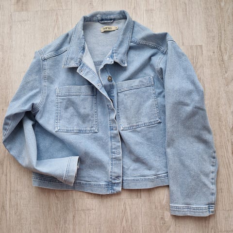 Nanson pirteän keltainen Lykky-farkkutakki koossa 44. Edessä kaksi avointa taskua ja metalliset napit.