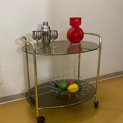 Retro, vintage, vanha, uusi, sohvapöytä, metalli, metallihuonekalu, design, messinki, messinkinen, kromi, kotimainen, lasipöytä, lasi, baarivaunu, baarikärry, sivupöytä, taso, vaunu, kärry