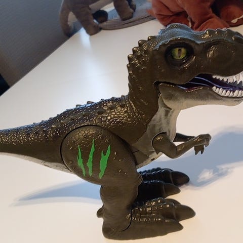 Iso muovinen ja sisältä pehmeä dinosaurus, korkeus 28cm pituus 43cm ja häntä joustaa eli voi taittaa jos toridiilillä. Nouto tai toridiili.