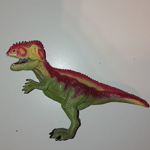 Iso muovinen ja sisältä pehmeä dinosaurus, korkeus 28cm pituus 43cm ja häntä joustaa eli voi taittaa jos toridiilillä. Nouto ainoastaan.