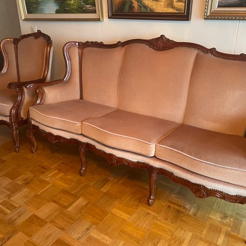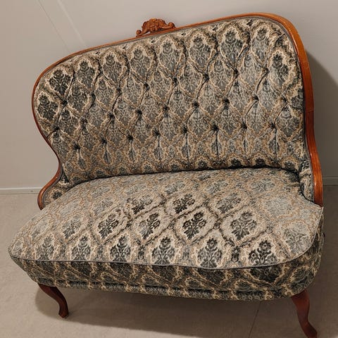 Rokokoo-tyyli on peräisin 1700-luvun Ranskasta, ja se tunnetaan koristeellisista muodoistaan ja yksityiskohtaisista kaiverruksistaan. Tämä sohva edustaa tyylin kevyempää ja leikkisämpää puolta.