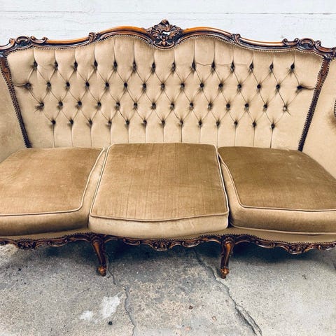 Hakusanat: antiikkinen, käytetyt huonekalut, vintage, vintage huonekalut, retro, rokokoo, istuin, tyylikäs, sisustus, chippendale, kolmen istuttava, huonekalut, kaiverrus, koristeellinen, ranskalainen, puu, beige, sohva, Valmistaja, antiikki, perinteinen